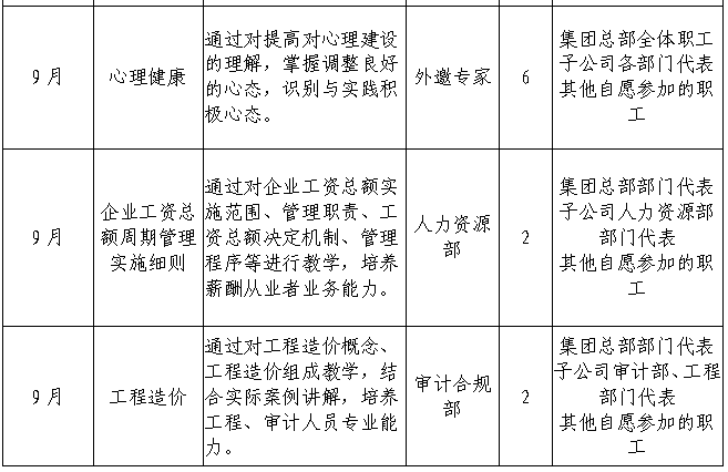 指定為員工心理健康課,需推薦并邀請業(yè)內(nèi)一流專業(yè)講師對集團本部職工開展心理建設(shè)指導(dǎo),引導(dǎo)職工建立積極向上的工作、生活心態(tài)。