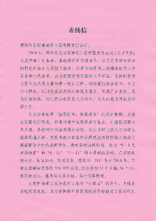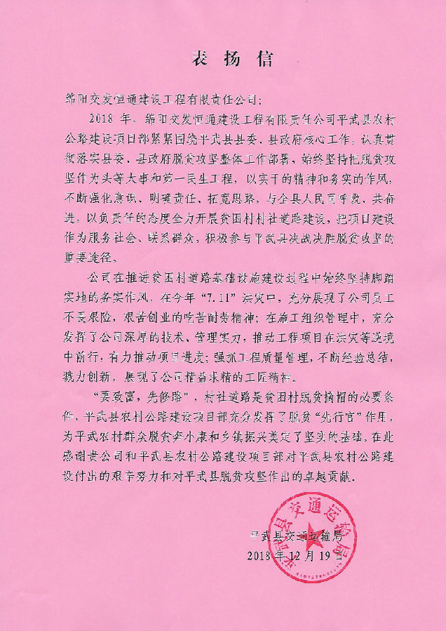 近日,恒通建工分別收到了來自平武縣人民政府和平武縣交通運(yùn)輸局的兩封表揚(yáng)信。信中對(duì)恒通建工在平武農(nóng)村公路項(xiàng)目實(shí)施過程中,以通村通社道路的修建為基點(diǎn),促進(jìn)產(chǎn)業(yè)發(fā)展,切實(shí)履行社會(huì)責(zé)任,充分發(fā)揮脫貧“開路者”和“先行官”的精神進(jìn)行了表揚(yáng)。特別是在今年“7.11”洪災(zāi)中,恒通建工攻堅(jiān)克難、吃苦耐勞,推動(dòng)項(xiàng)目在逆境中前行;強(qiáng)抓工程質(zhì)量管理,展現(xiàn)了精益求精的工匠精神;在有限的時(shí)間內(nèi),加班加點(diǎn),已累計(jì)完成鋪建道路約556.829公里,總涉及約23個(gè)鄉(xiāng)鎮(zhèn),56個(gè)村,惠及數(shù)萬人,基本實(shí)現(xiàn)各鄉(xiāng)鎮(zhèn)、各村道路暢通,為平武農(nóng)村群眾脫貧奔小康和鄉(xiāng)鎮(zhèn)振興奠定了堅(jiān)實(shí)的基礎(chǔ)。