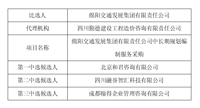綿陽交通發(fā)展集團(tuán)有限責(zé)任公司人力資源中長期規(guī)劃編制服務(wù)采購中選候選人公示