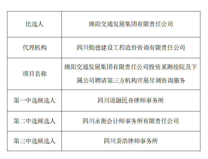綿陽交通發(fā)展集團有限責任公司投資某測繪院及下屬公司聘請第三方機構(gòu)開展盡調(diào)咨詢服務中選候選人公示