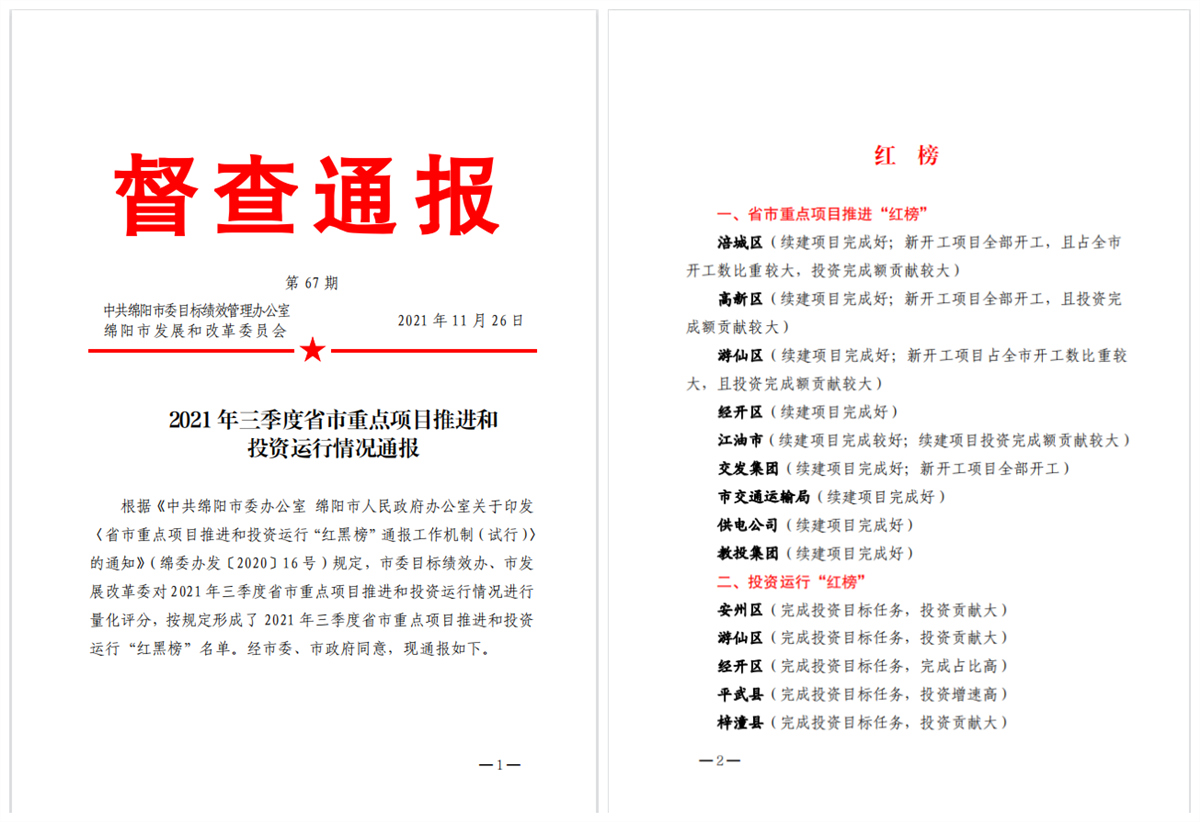 2021年11月26日,市目標(biāo)績效辦、市發(fā)改委發(fā)布了《2021年三季度省市重點(diǎn)項目推進(jìn)和投資運(yùn)行情況通報》。經(jīng)市委、市政府同意,集團(tuán)榮獲2021年三季度省市重點(diǎn)項目推進(jìn)“紅榜”。