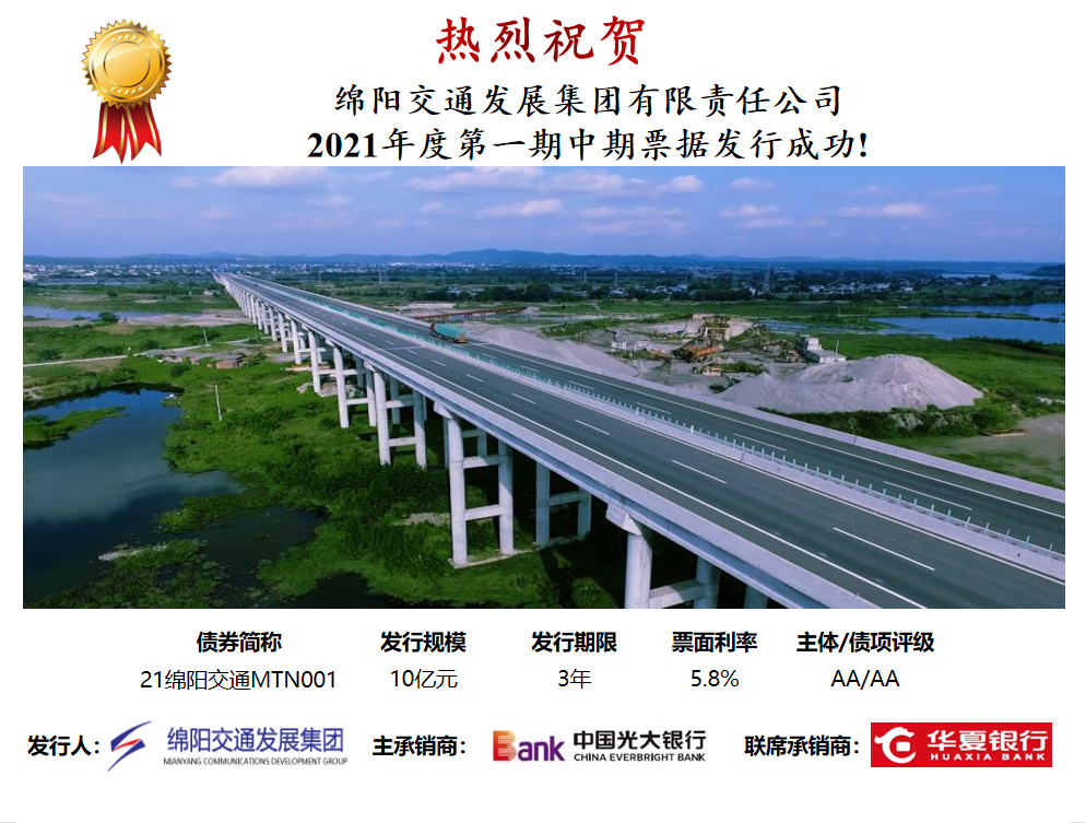 ? ? ? ?6月18日,“綿陽交通發(fā)展集團有限責任公司2021年度第一期中期票據(jù)”(簡稱“21綿陽交通MTN001”)在銀行間市場成功發(fā)行,債券代碼:102101130,發(fā)行規(guī)模10億元,產品期限3年,票面利率5.8%。為增加有效申購金額,確保以較低成本發(fā)行本期中票,公司積極向金融機構推介,加強對接,為本次中票順利發(fā)行奠定了堅實基礎。