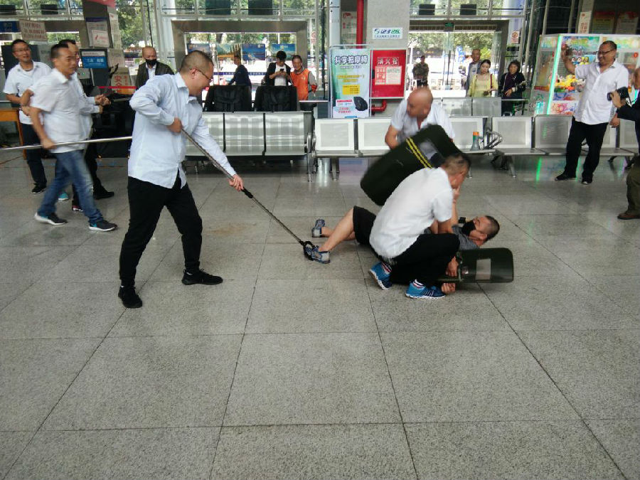 演練有序。在警官現(xiàn)場指導(dǎo)下,參演人員“一對一”對抗演習(xí)中熟練運(yùn)用安保設(shè)施保護(hù)自己、有效壓制“歹徒”。場景設(shè)置演練中,面對“歹徒”攜帶管制刀具強(qiáng)行沖過客運(yùn)總站安檢并現(xiàn)場施暴的突發(fā)事件,警戒組隊員及時發(fā)出“防暴警報”信號,防暴組隊員及時趕赴現(xiàn)場建立安全防線,壓縮“歹徒”活動范圍并有效制服;疏散組隊員現(xiàn)場有序引導(dǎo)疏散旅客群眾,演練過程人員安全。