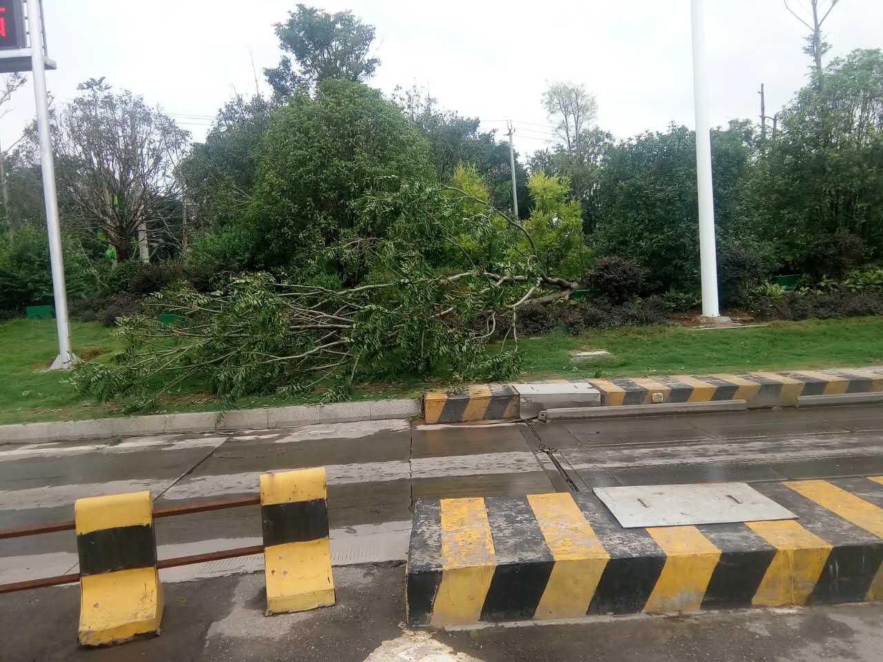 7月16日凌晨,綿陽市區(qū)出現(xiàn)短時雷雨大風(fēng)極端天氣,部分地方瞬時風(fēng)速每秒25米,再加上高強(qiáng)度的降雨,導(dǎo)致市區(qū)兩千多株樹木倒伏。16日清晨6點(diǎn),集團(tuán)下屬綿陽路橋公司立即組織相關(guān)巡查工作,在巡查中發(fā)現(xiàn)磨家收費(fèi)站綠化帶發(fā)生大量綠化苗木倒塌險情。
