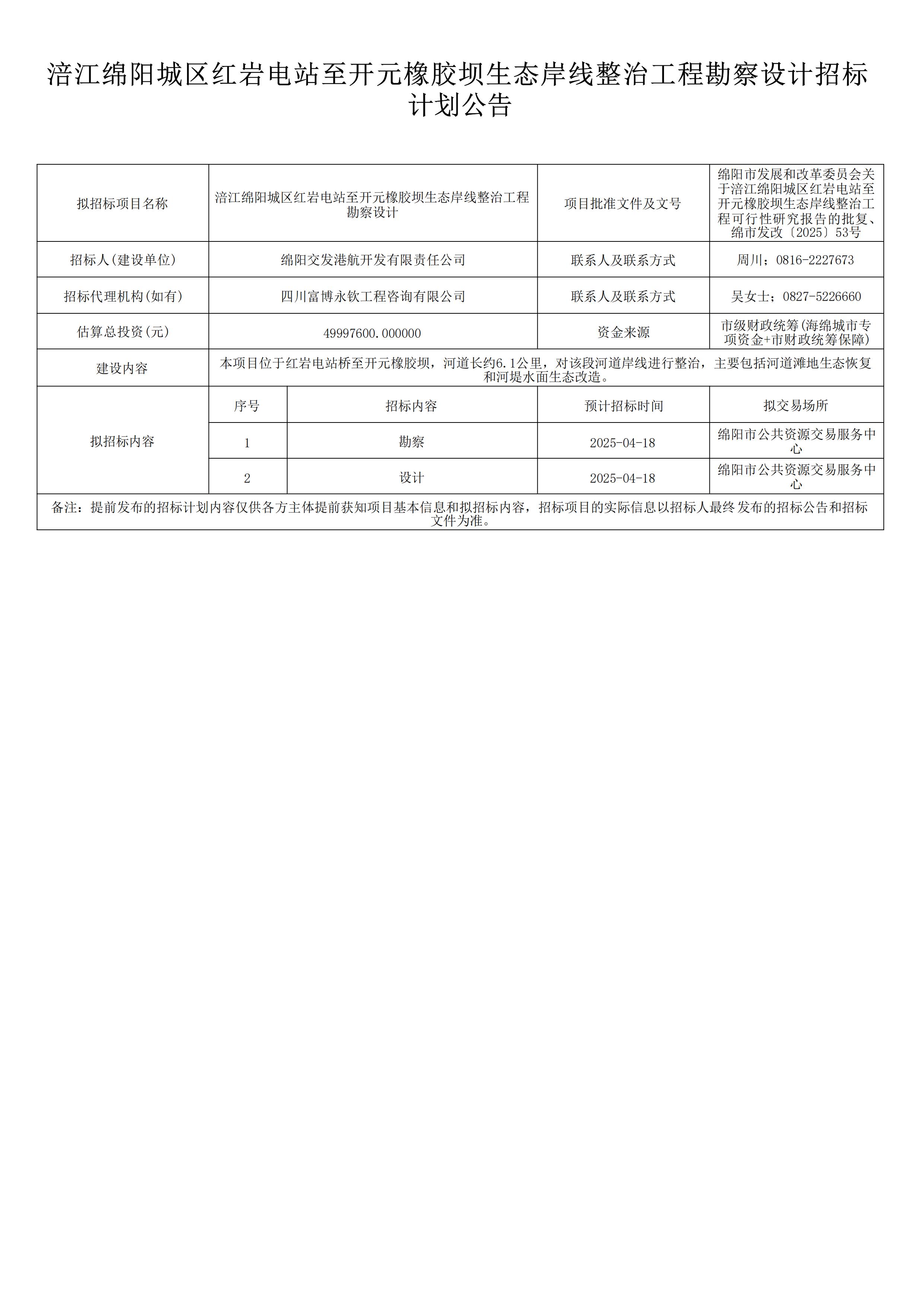 涪江綿陽城區(qū)紅巖電站至開元橡膠壩生態(tài)岸線整治工程勘察設(shè)計招標(biāo)計劃公告