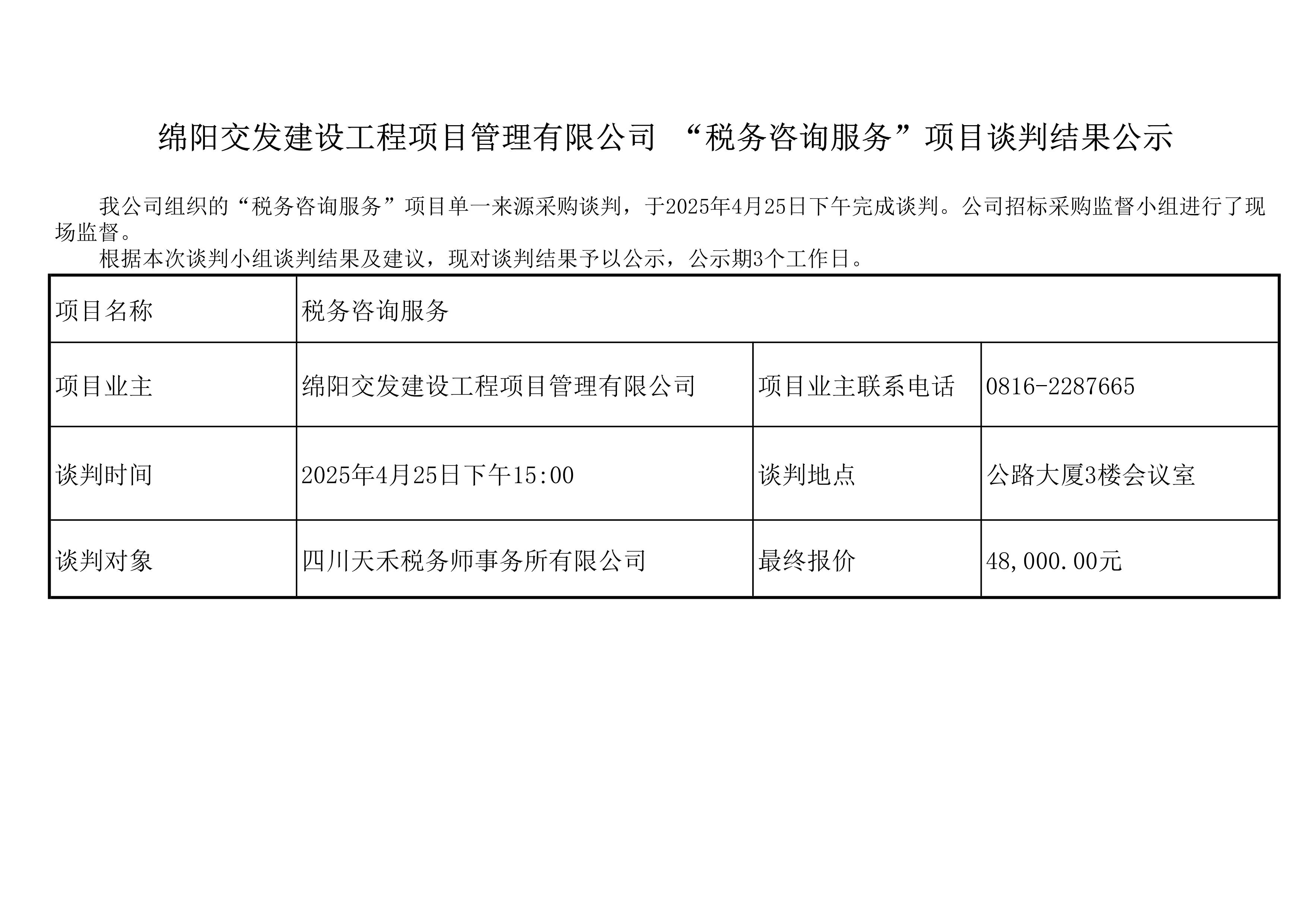 綿陽交發(fā)建設工程項目管理有限公司 “稅務咨詢服務”項目談判結果公示