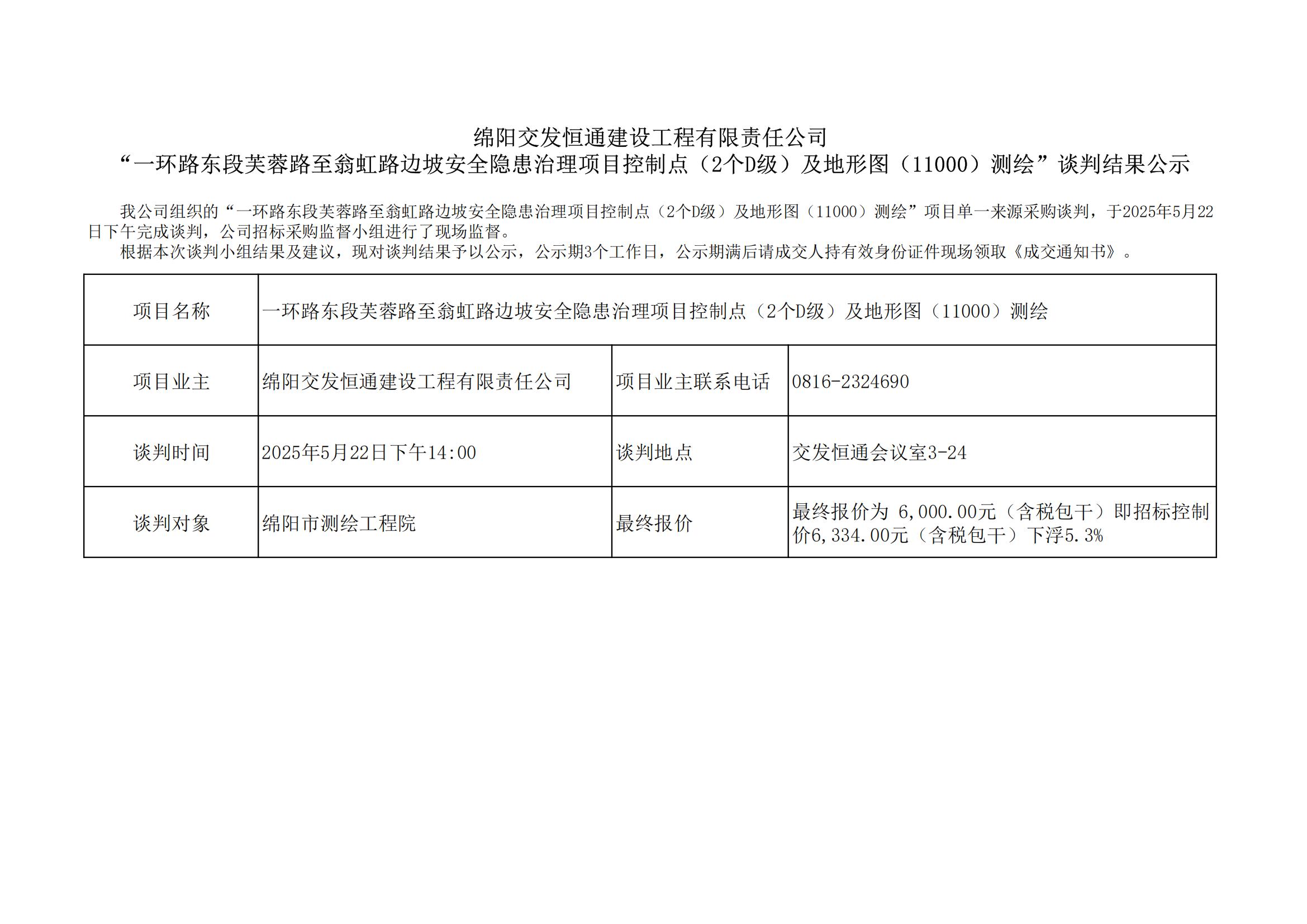 綿陽交發(fā)恒通建設(shè)工程有限責(zé)任公司一環(huán)路東段芙蓉路至翁虹路邊坡安全隱患治理項(xiàng)目控制點(diǎn)(2個(gè)D級(jí))及地形圖(11000)測(cè)繪談判結(jié)果公示