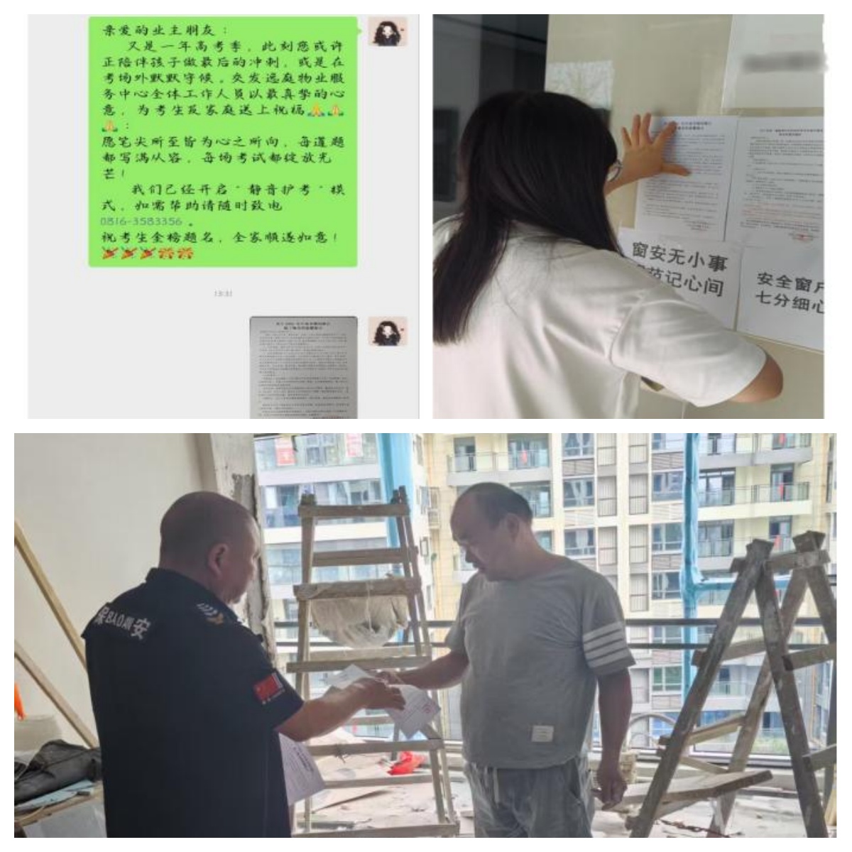 溫情服務(wù),撐起安心傘。交發(fā)實(shí)業(yè)多措并舉開展“溫情護(hù)考”物業(yè)行動(dòng),安排專人24小時(shí)值守監(jiān)控室并增加小區(qū)巡邏頻次,重點(diǎn)關(guān)注人員活動(dòng)、車輛通行等情況,及時(shí)發(fā)現(xiàn)可能產(chǎn)生噪音源,做到早發(fā)現(xiàn)、早協(xié)調(diào)、早解決;積極主動(dòng)與裝修業(yè)主和小區(qū)底商溝通,逐一上門發(fā)放《禁噪告知書》,同時(shí)通過業(yè)主微信群、朋友圈、小區(qū)公告欄、電梯轎廂等線上線下渠道發(fā)布《靜音倡議書》,呼吁全體業(yè)主攜手開啟“靜音模式”,為小區(qū)考生打造安靜、和諧、溫馨的備考環(huán)境。