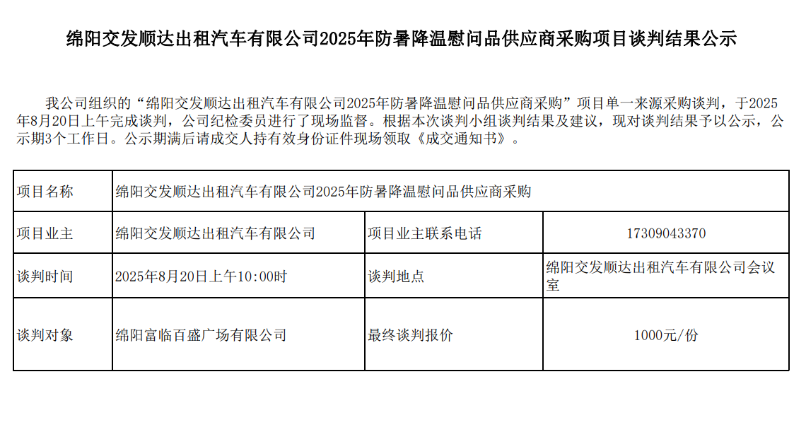 綿陽(yáng)交發(fā)順達(dá)出租汽車有限公司2025年防暑降溫慰問品供應(yīng)商采購(gòu)項(xiàng)目談判結(jié)果公示