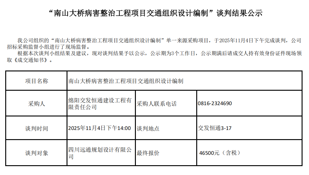 南山大橋病害整治工程項(xiàng)目交通組織設(shè)計(jì)編制談判結(jié)果公示