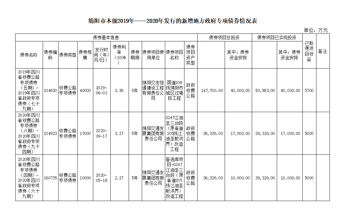 綿陽(yáng)交通發(fā)展集團(tuán)有限責(zé)任公司關(guān)于綿陽(yáng)市本級(jí)2019年——2020年發(fā)行的新增地方政府專項(xiàng)債券情況